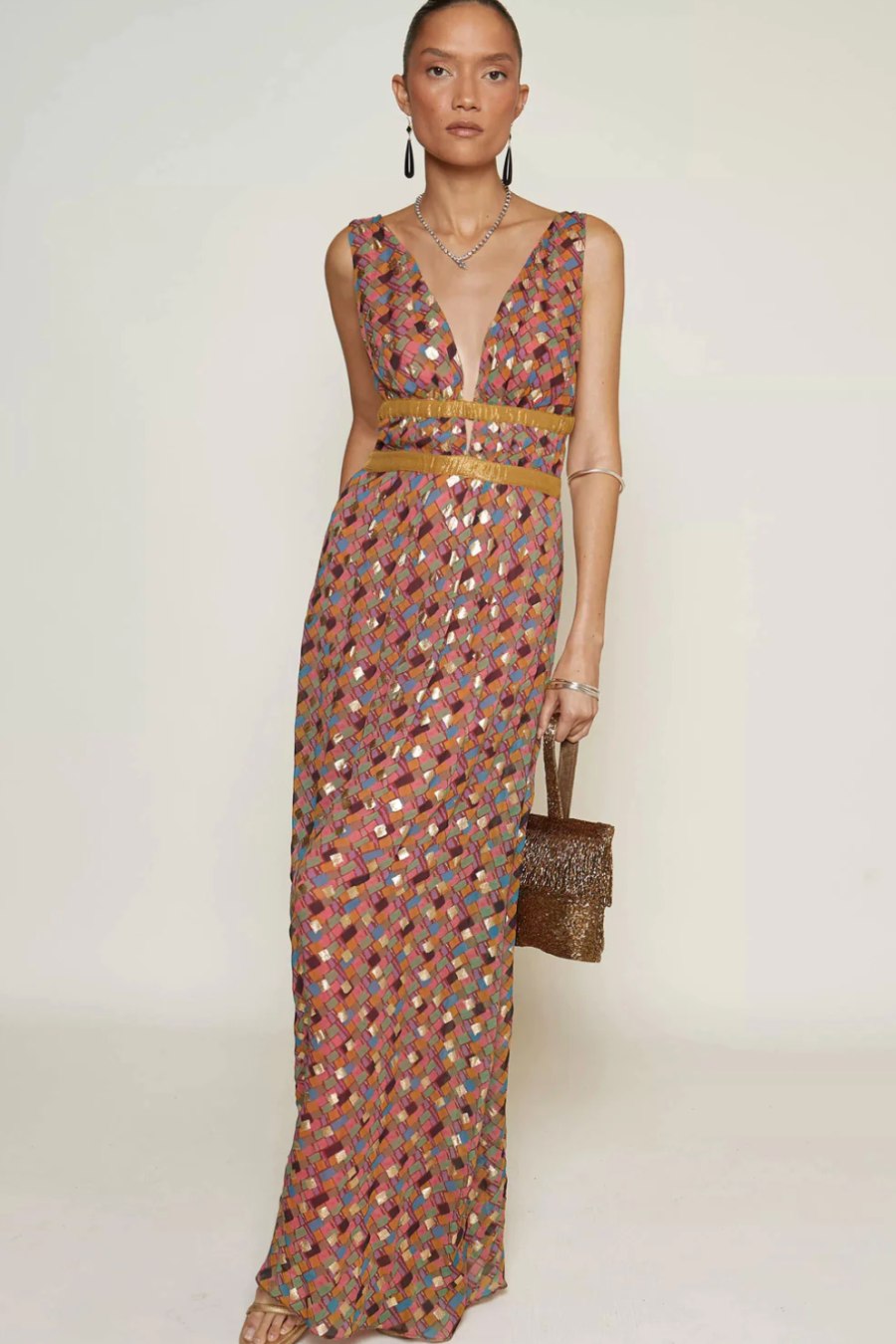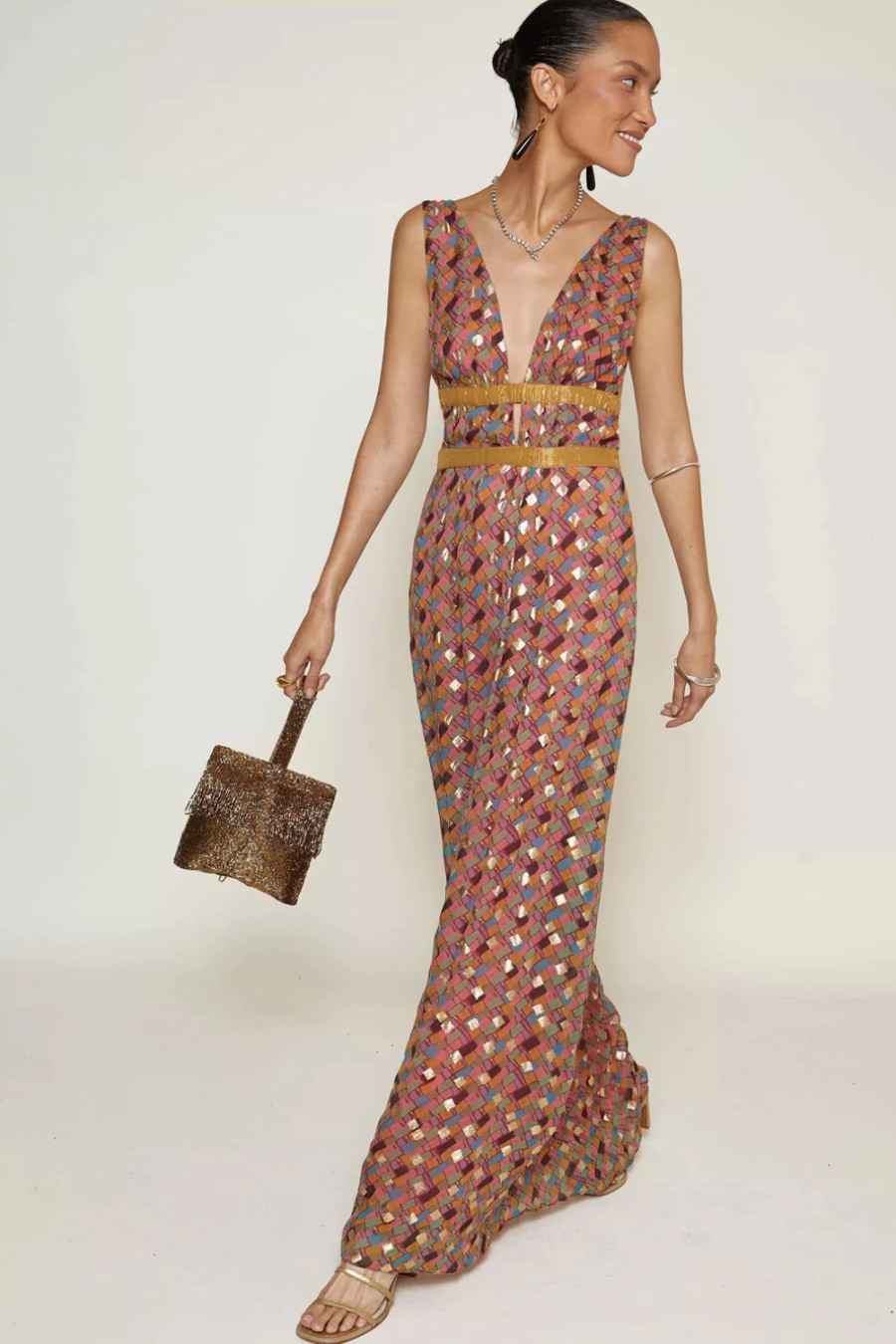 Our Charlotte gown returns in a striking gold-pigment patchwork print inspired by Gustav Klimt's artwork and a vintage jewellery box.