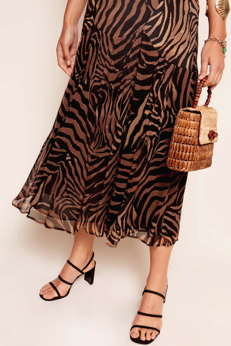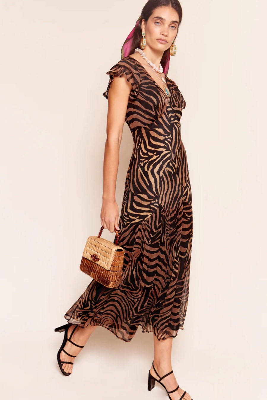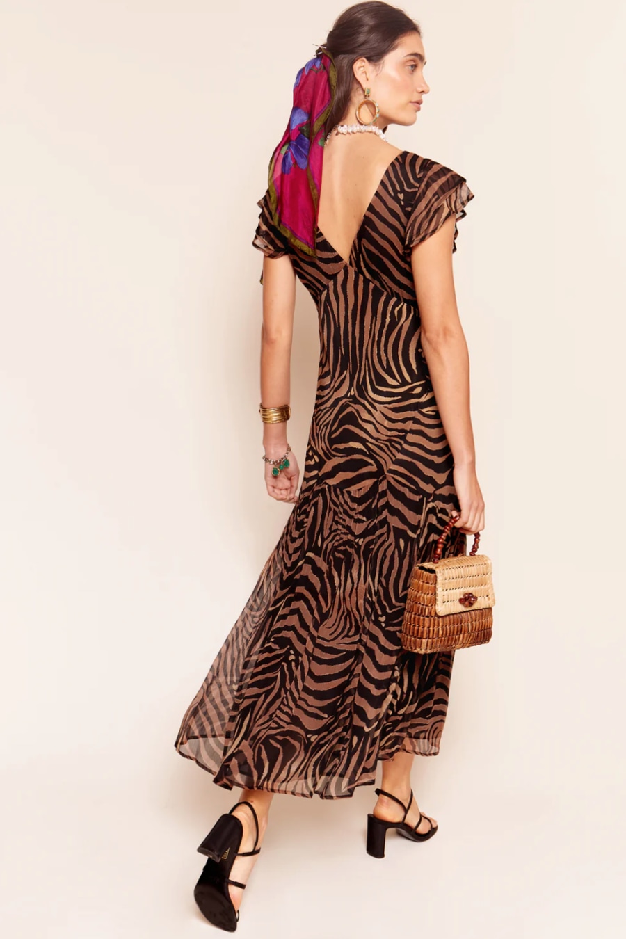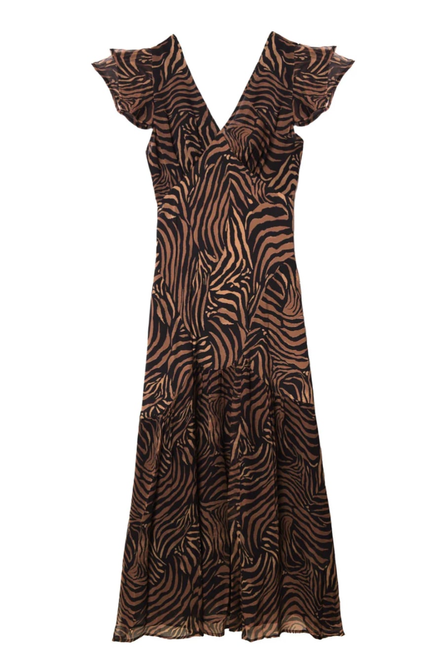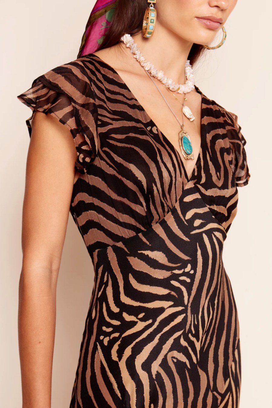 Available in regular and petite. We've updated the fit of our bestselling silk crepe de chine Cinzia dress so the chiffon skirt hangs even more beautifully. The empire seam at the waistband flatters the bust and, although the back is low, it conceals a bra.