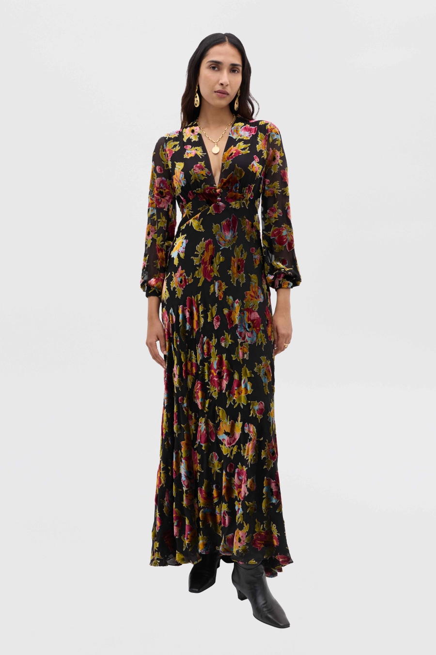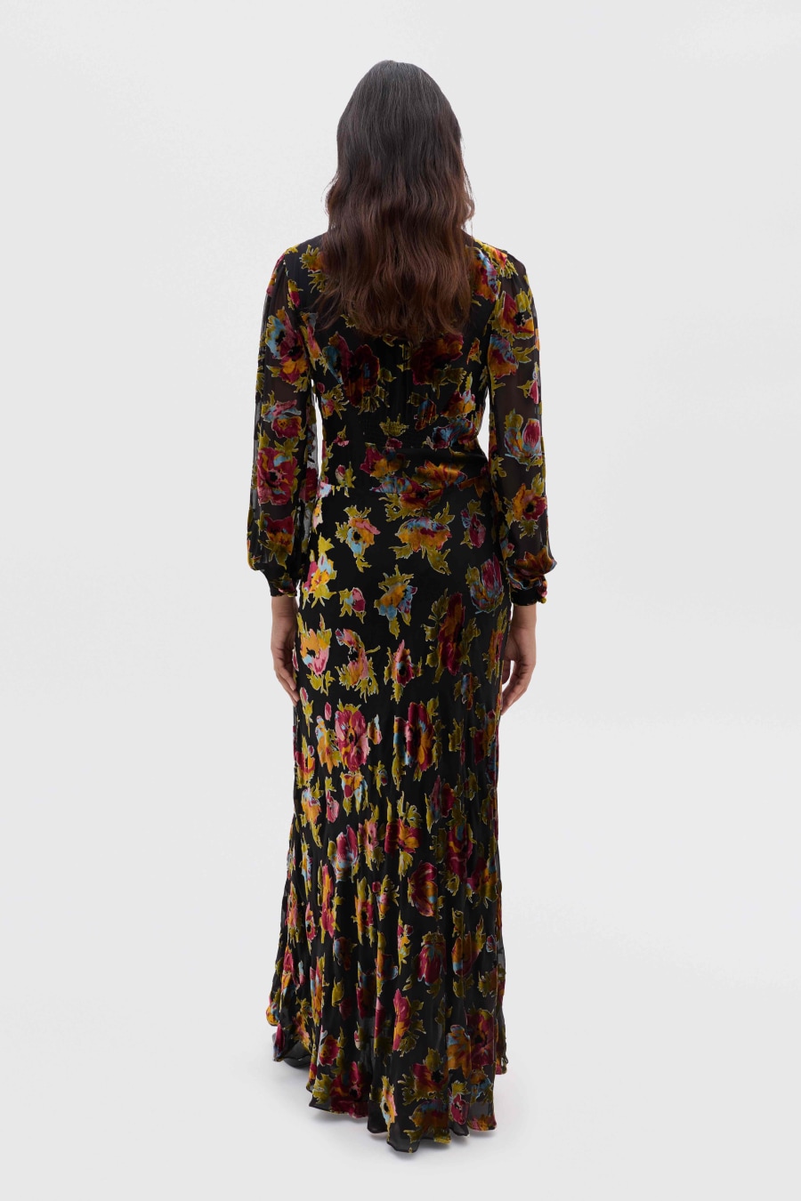 Feminine and refined. Discover RIXO’s iconic Emory gown, patterned with a vintage-inspired floral print and crafted from plush Devoré. The deep V-neck, nipped in waistband and long blouson sleeves make it a timeless choice for any special occasion.