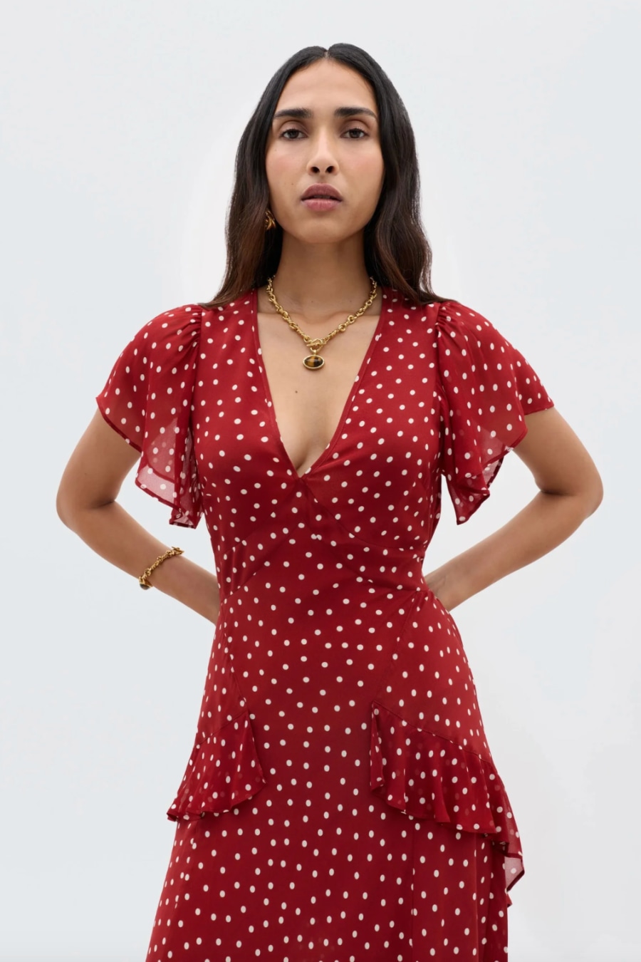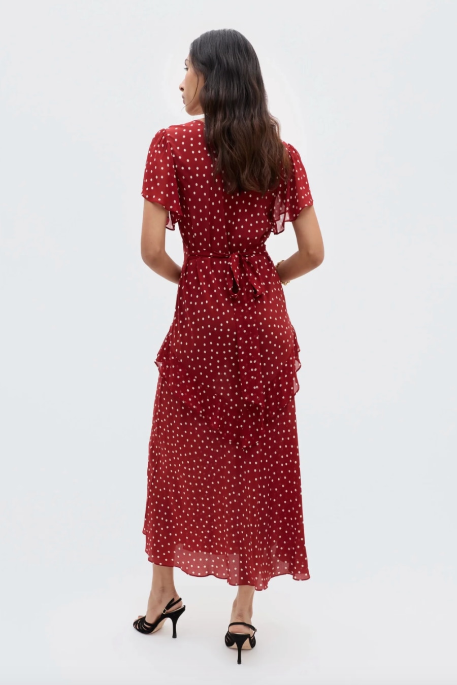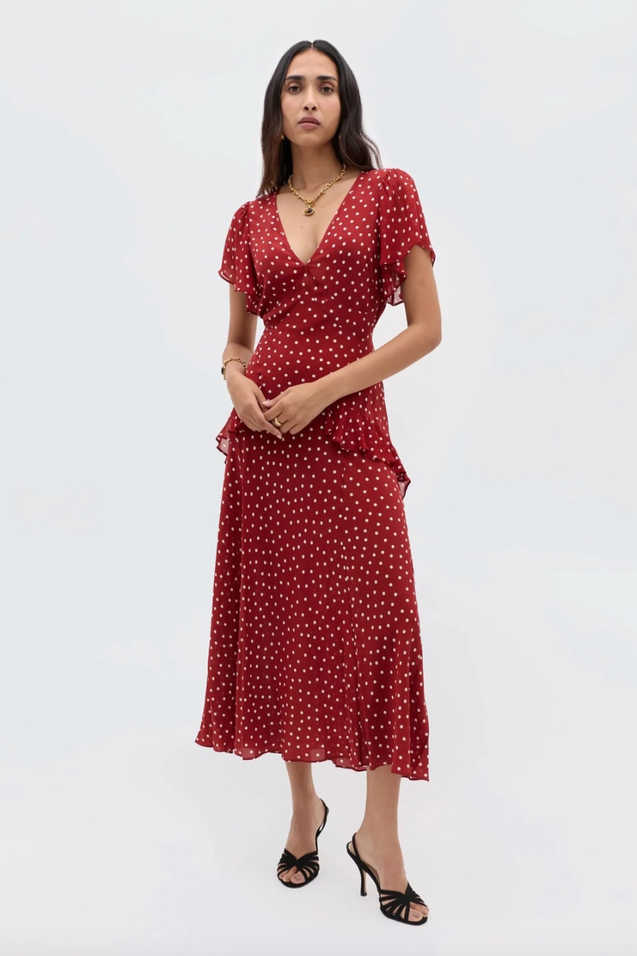 Meet RIXO icon, Evie. Rendered from a silk Crepe de Chine, it has a luxurious feel and drapes beautifully. The fluttery georgette ruffles take inspiration from expressive 1970s styles and this polka dot print is a timeless classic. A versatile wardrobe staple – wear to work, on holiday or to a wedding.