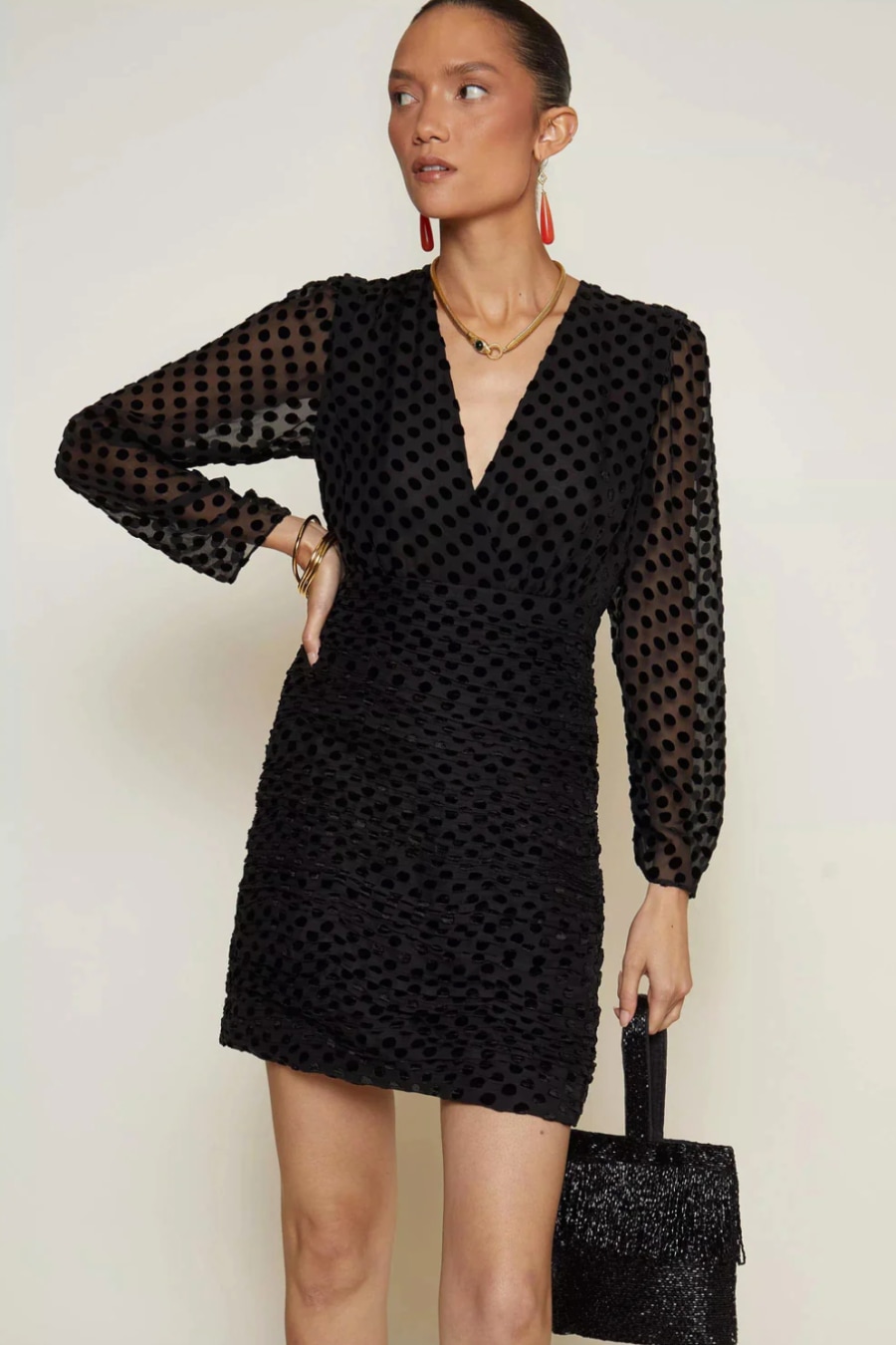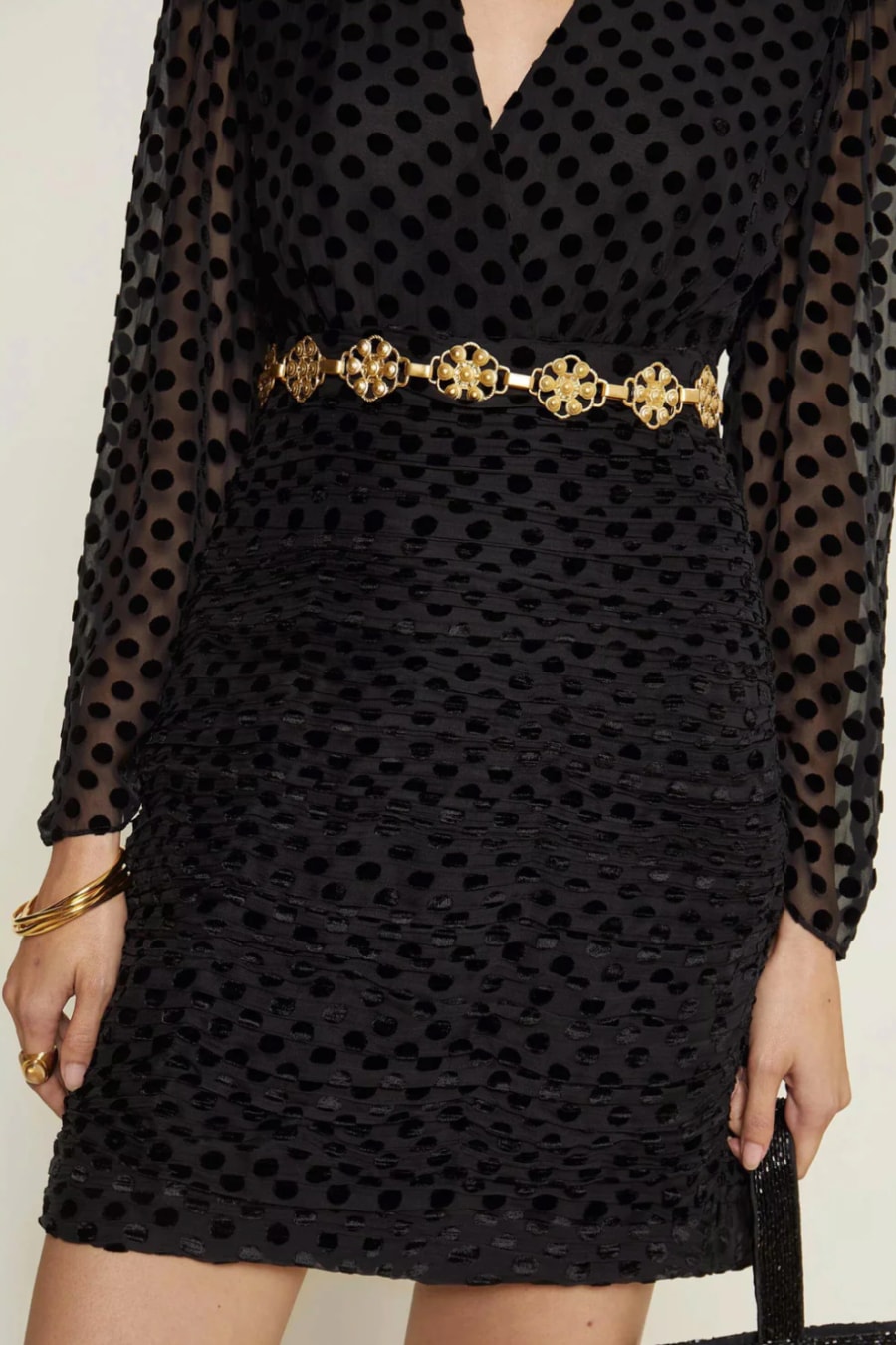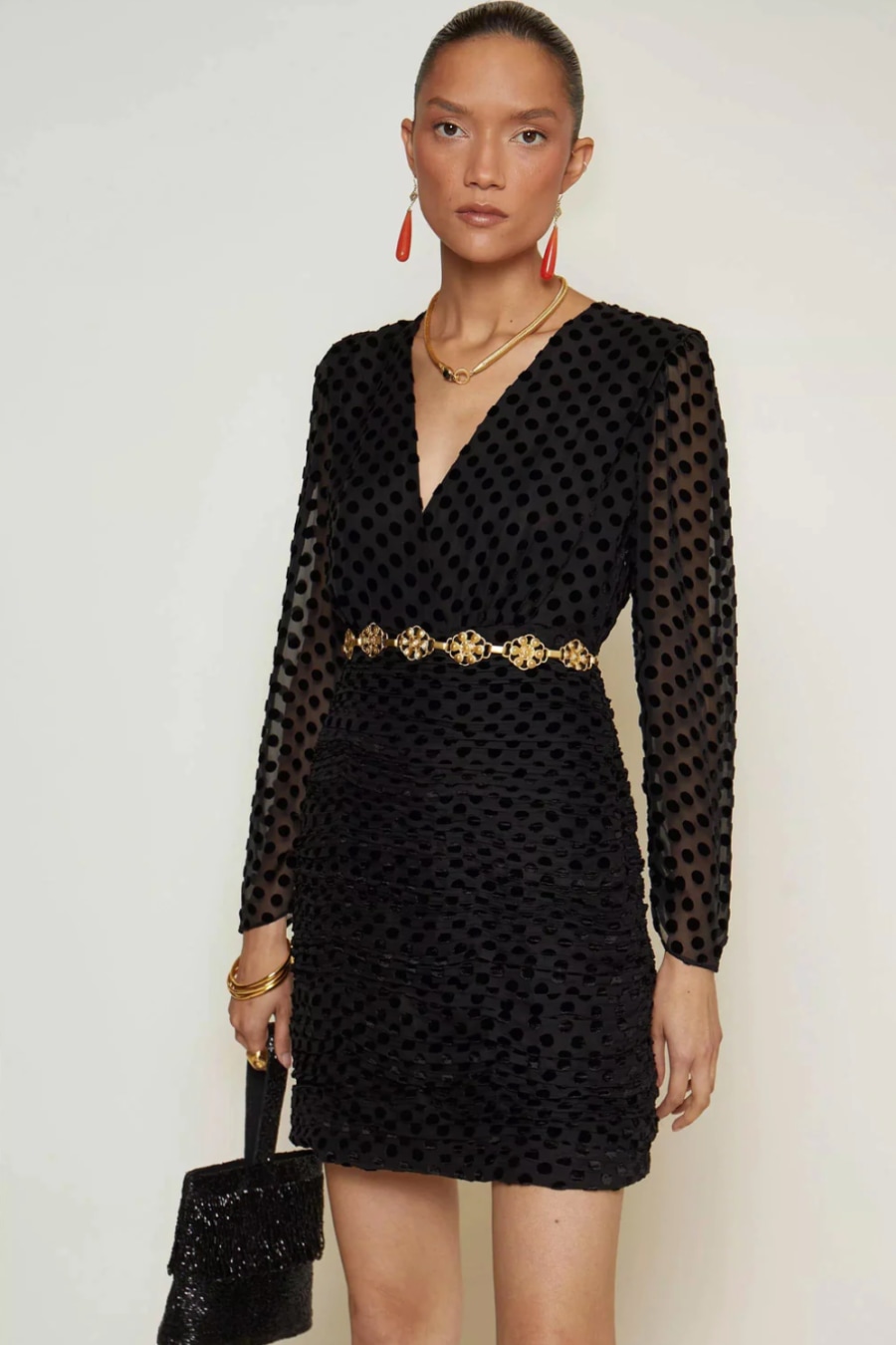 The Golden is a little black dress less ordinary, with her silk-mix devoré velvet-spot print, plunging neckline, and ruched mini skirt.