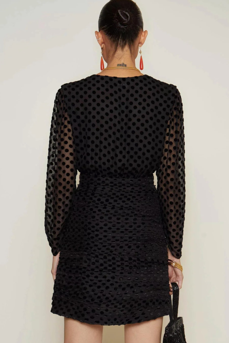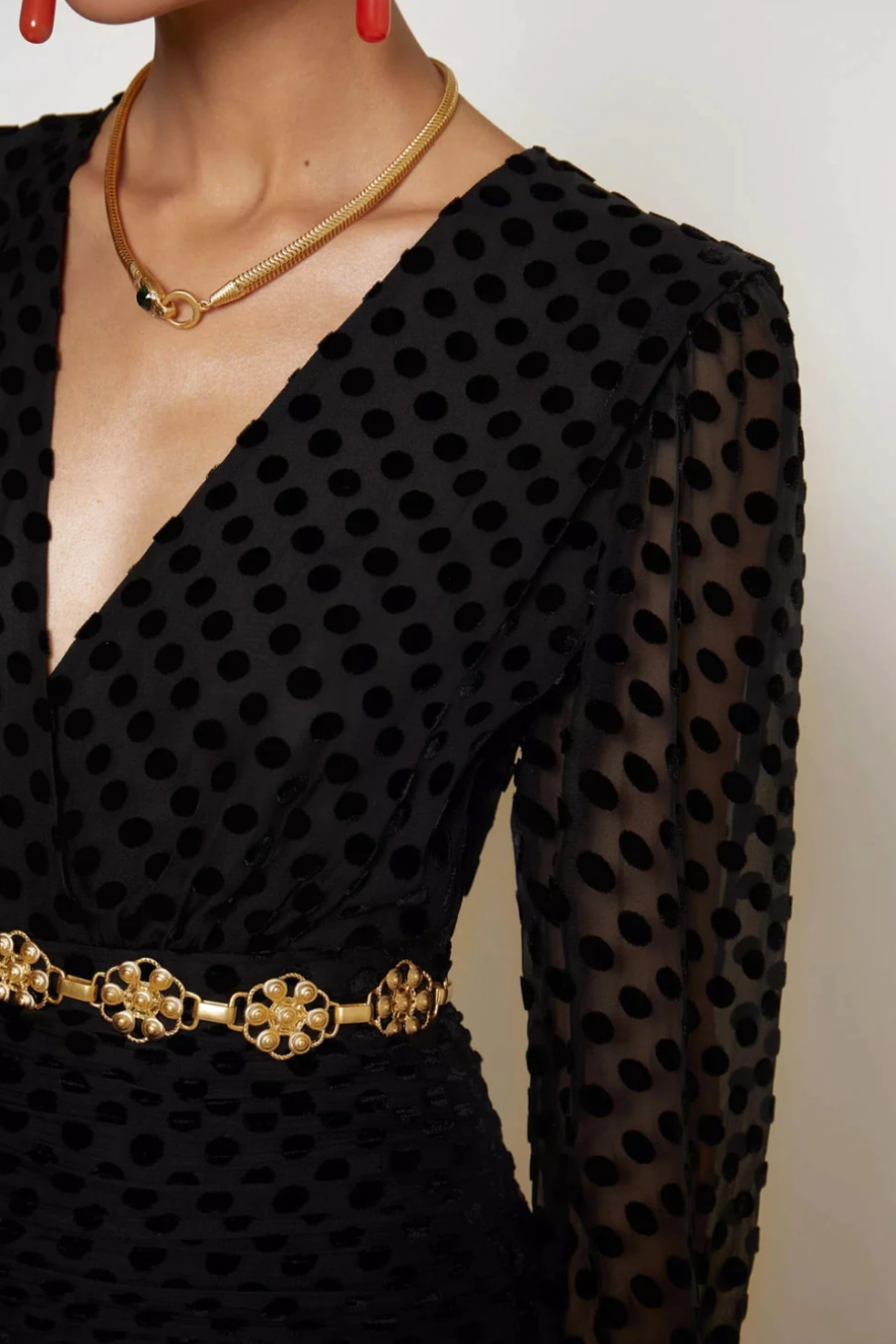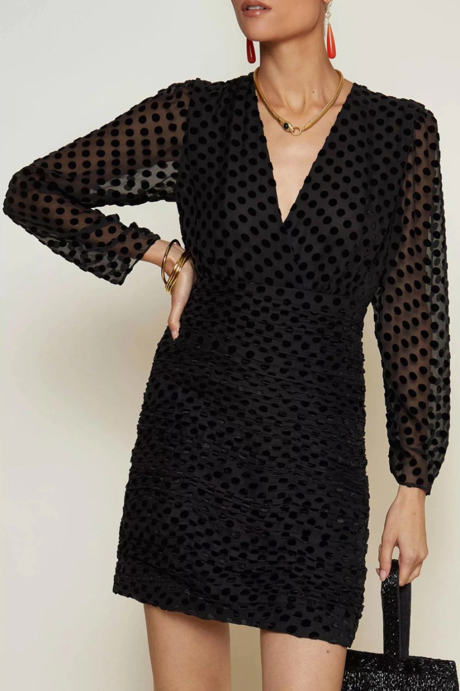The Golden is a little black dress less ordinary, with her silk-mix devoré velvet-spot print, plunging neckline, and ruched mini skirt.