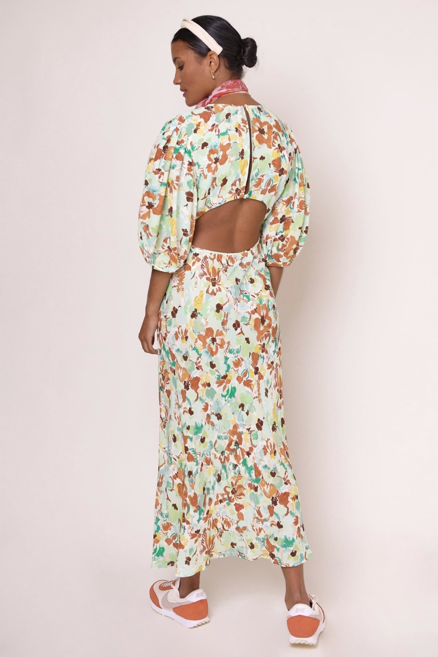 Garment length is 134 cm. Garment neck depth is 20 cm. She comes in under the bust at her empire waist and is cut on the bias to hang loosely along the body's lines and fall fluidly.