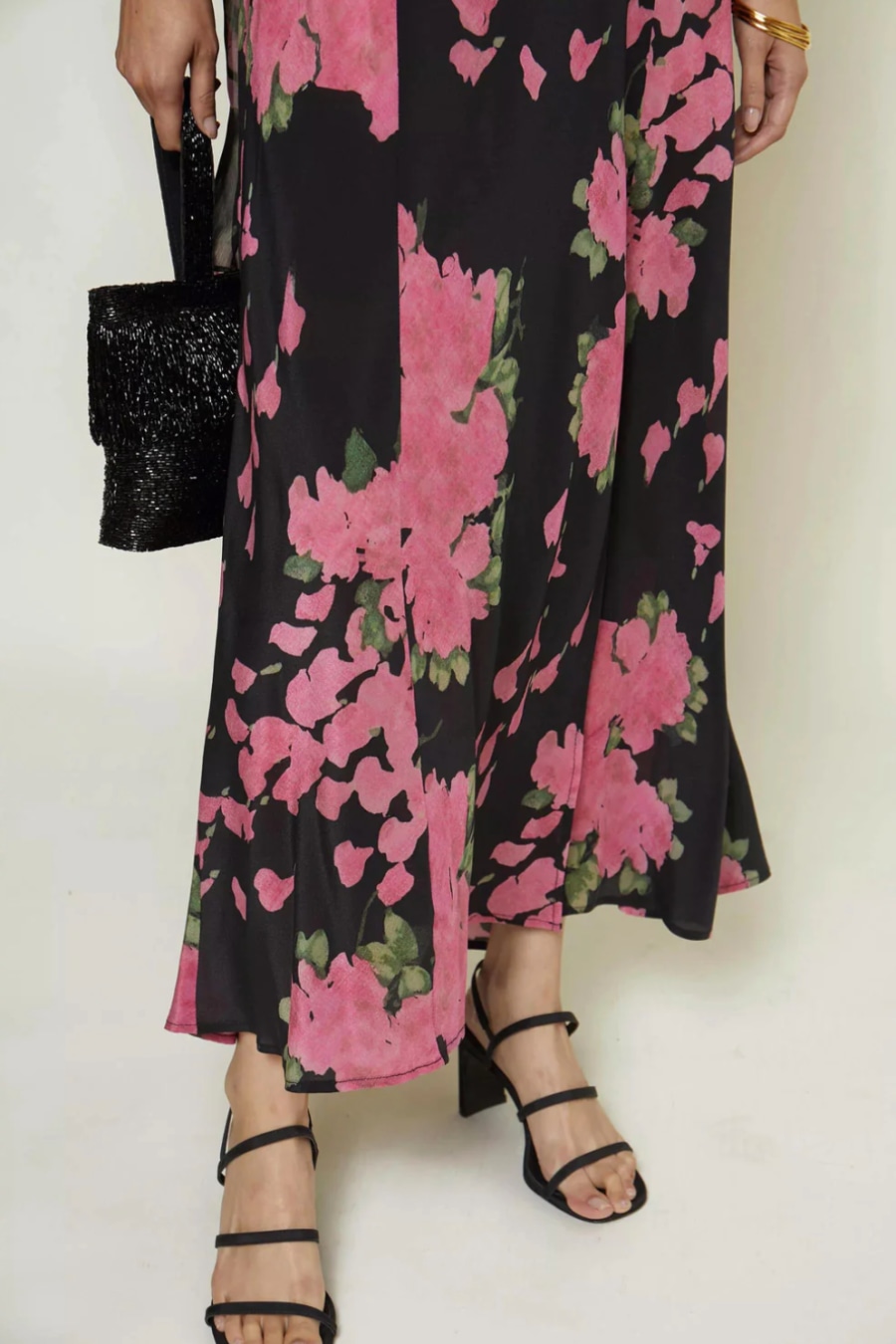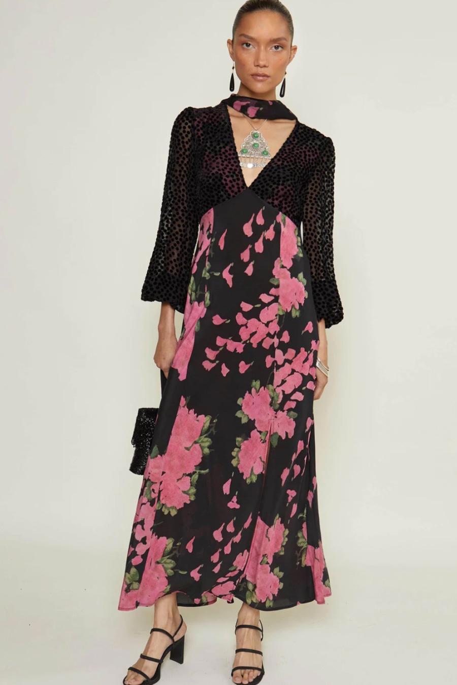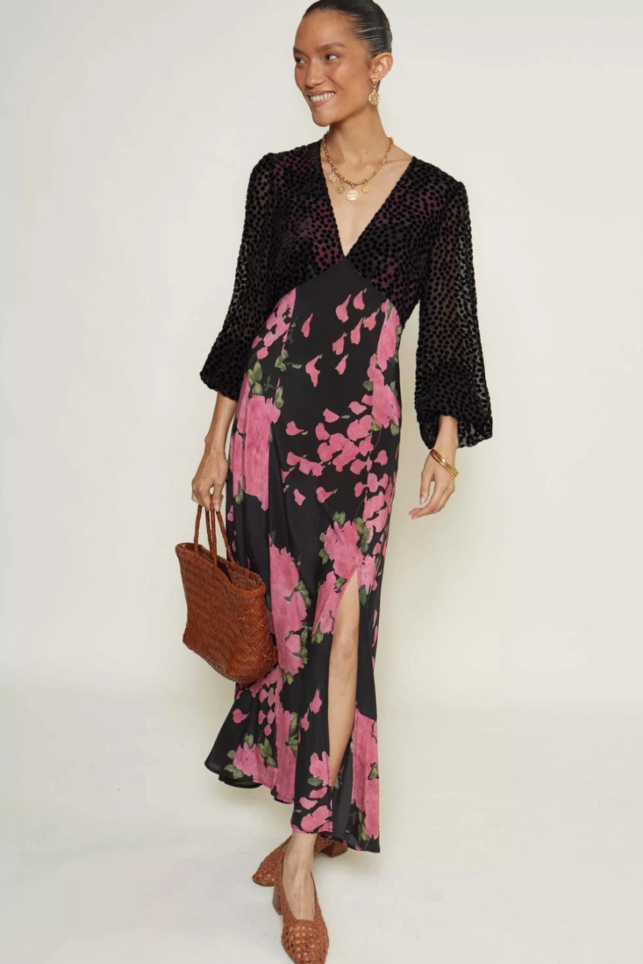 Delightfully pretty, the Melanie is an iconic RIXO shape with clashing pink floral and black velvet-spot prints and blouson sleeves.