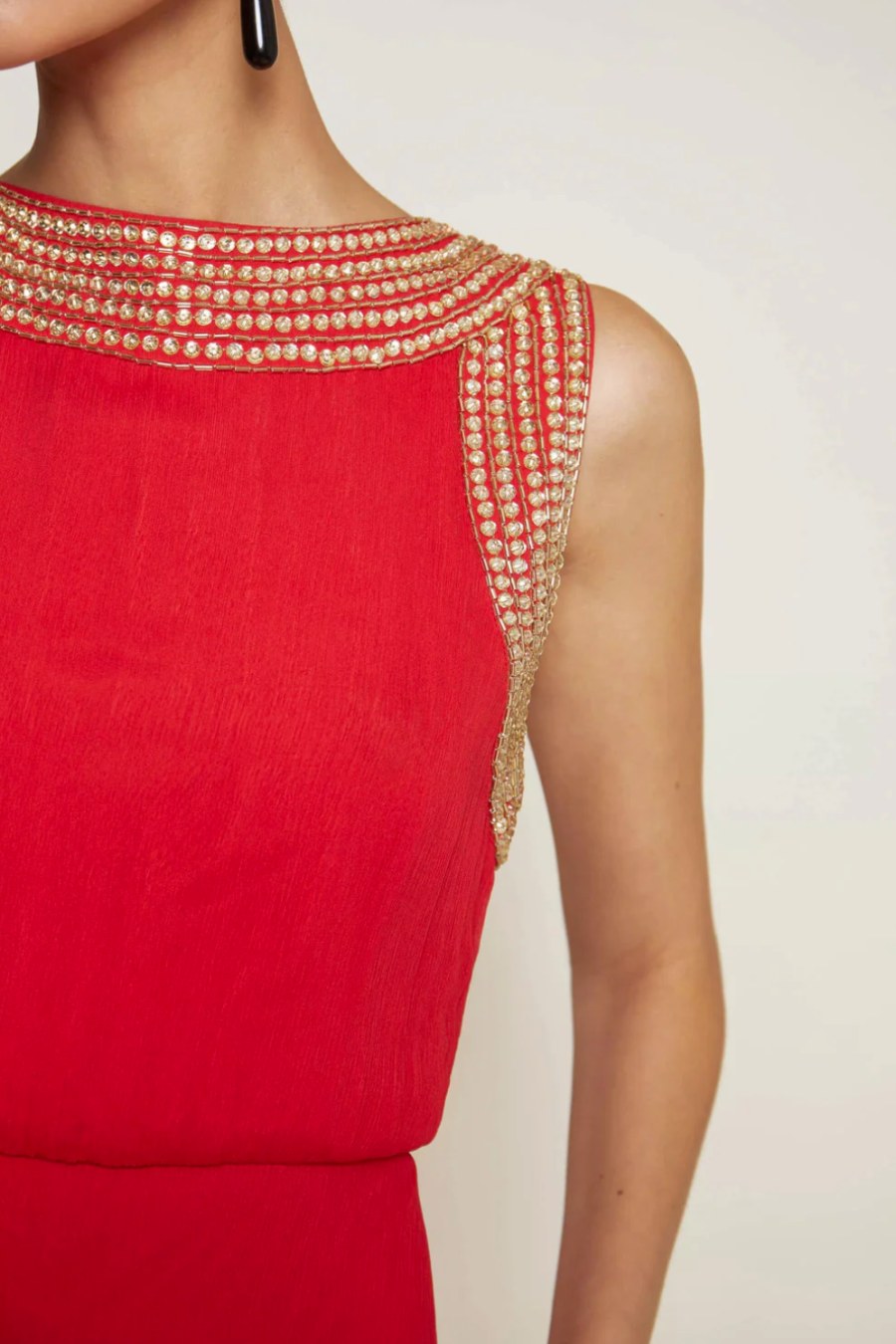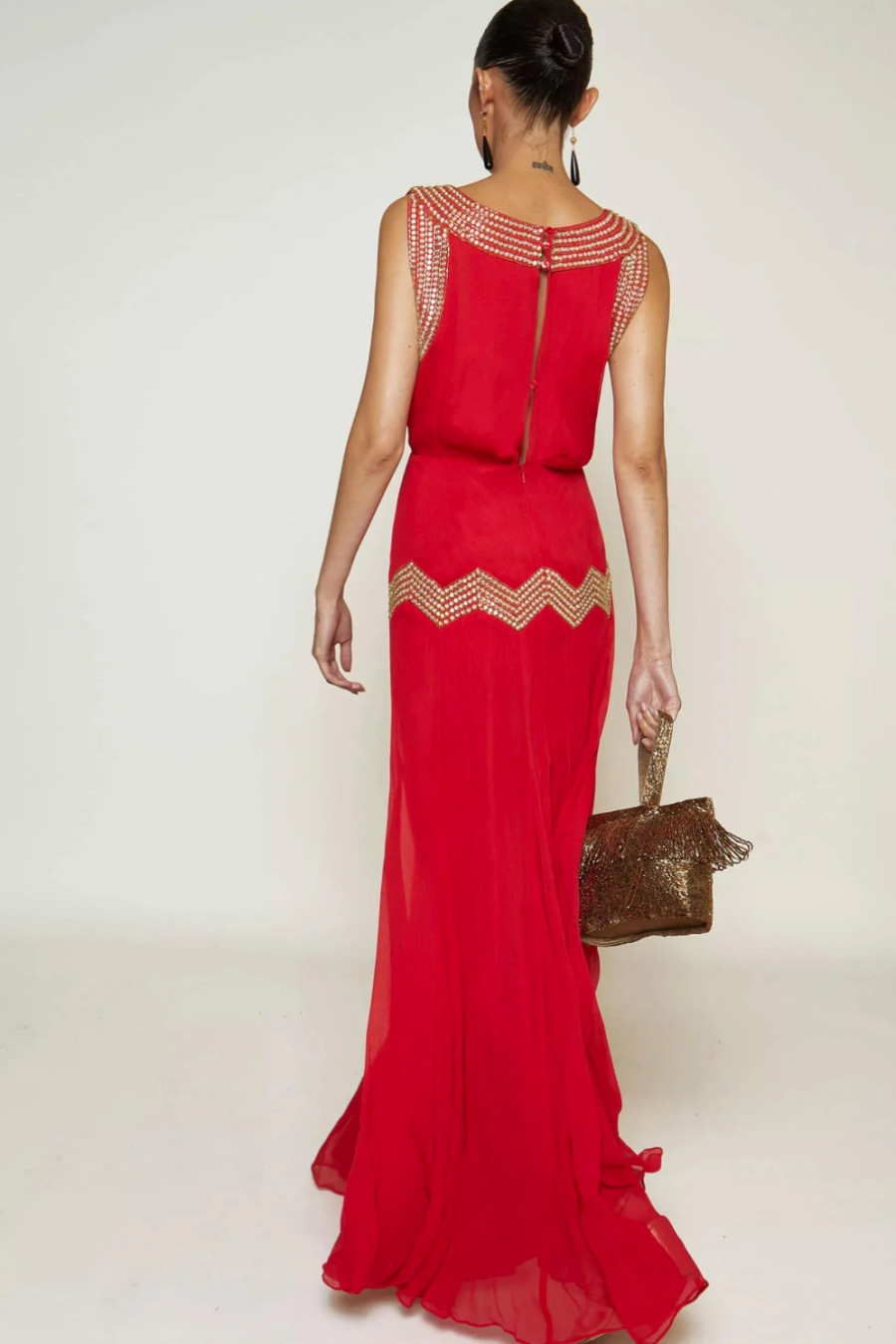 The Niva is a full-length red chiffon gown with crystal embellishments inspired by Ancient Egypt.