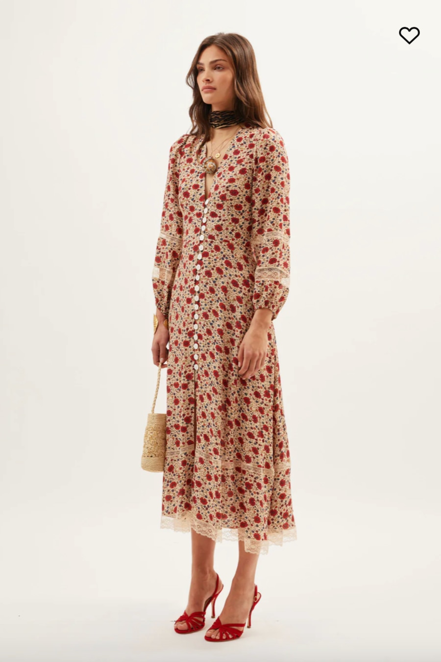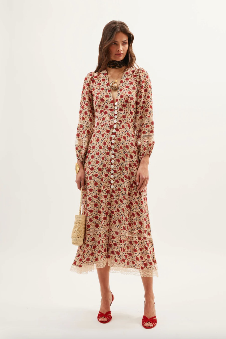 Raven is based on our Novara dress, but we've added long sleeves and delicate lace trims. The mixed prints are a RIXO signature and the mother-of-pearl buttons give such an elegant finish.